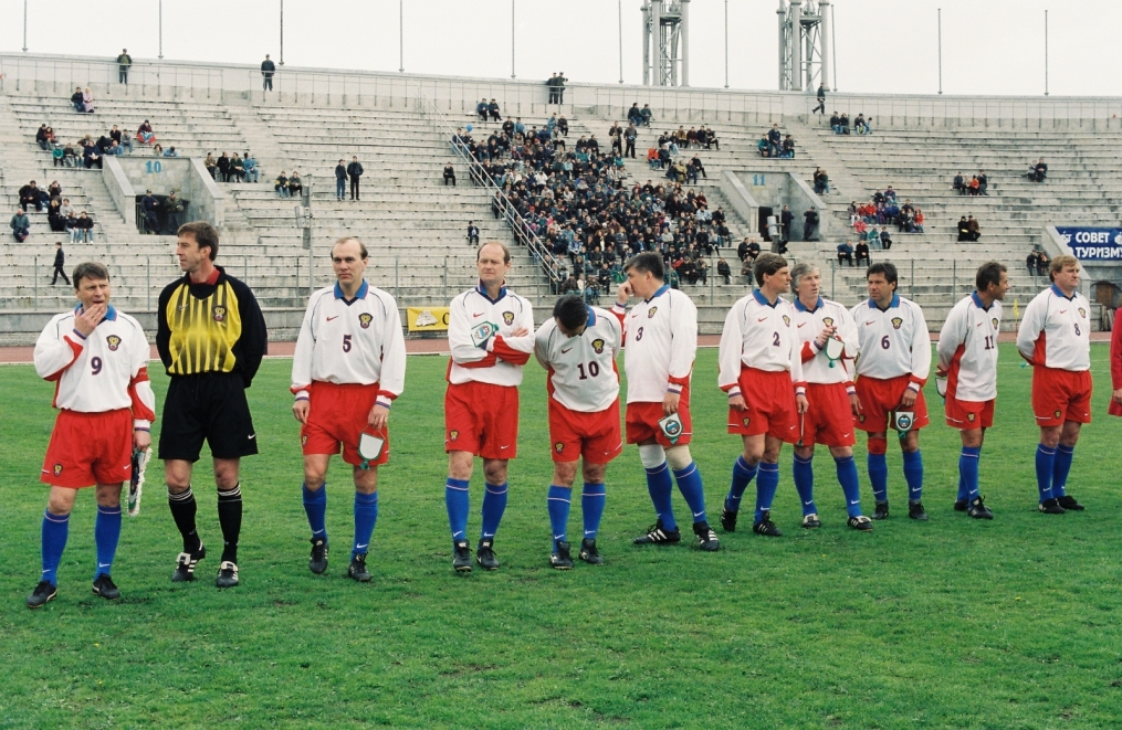 Описание: 25 мая 1997 года. Россия. Санкт-Петербург. «Петровский». Товарищеский матч сборных ветеранов Россия — Франция. На снимке футболисты сборной России (слева направо): Николай Ларионов, Михаил Бирюков, Вагиз Хидиятуллин, Александр Тукманов, Алексей Еськов, Александр Маховиков, Николай Воробьев, Виктор Папаев, Андрей Якубик, Виктор Колядко, Владимир Казаченок.