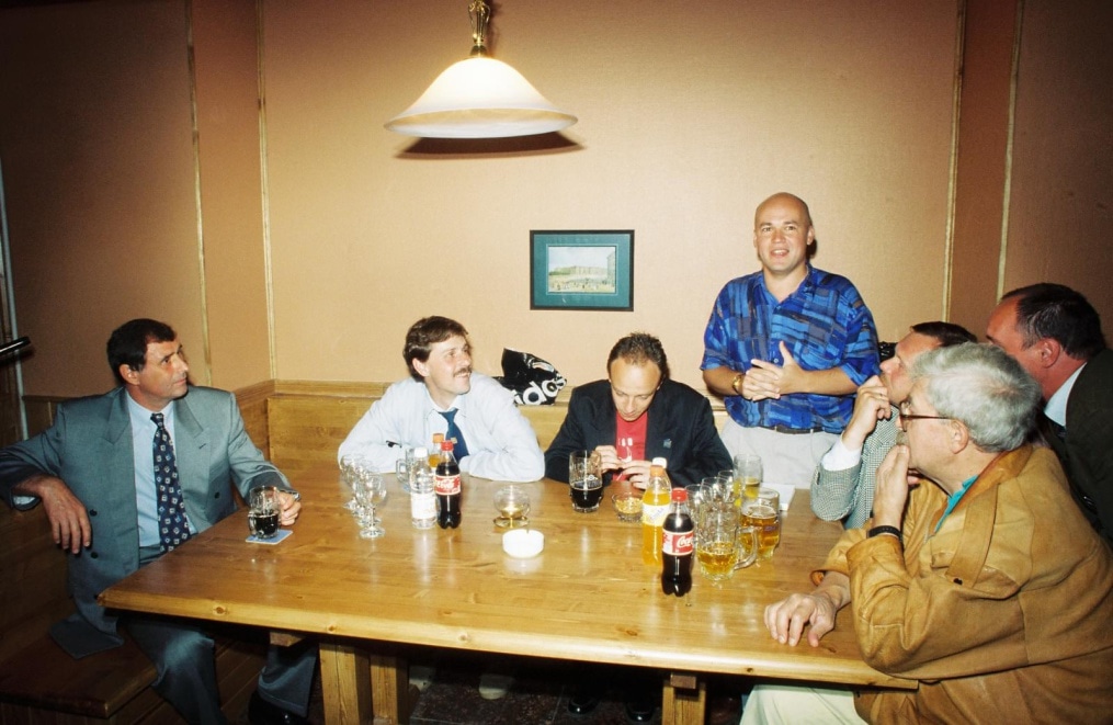 Описание: 1997 год. Россия. Санкт-Петербург. Кафе «Пит-стоп». Встреча с журналистами. На снимке (слева направо): главный тренер ФК «Зенит» Анатолий Бышовец, пресс-атташе ФК «Зенит» Александр Иванов, журналисты Кирилл Легков, Константин Осипов, Максим Березницкий, Сергей Струнин, Олег Вдовин,