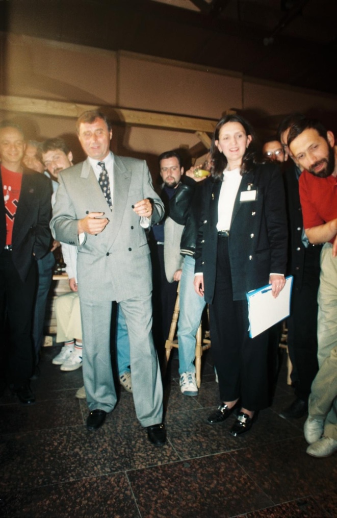 Описание: 1997 год. Россия. Санкт-Петербург. Встреча с журналистами в «Пит-стоп». На снимке (слева направо): журналист Кирилл Легков, главный тренер ФК «Зенит» Анатолий Бышовец, журналист Борис Ходоровский.