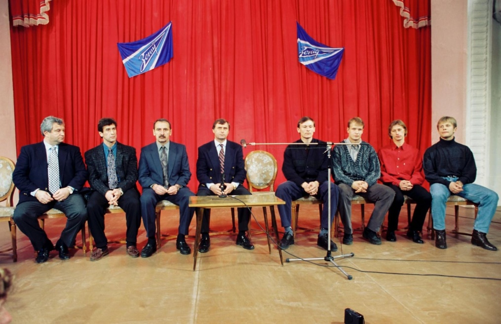 Описание: 1997 год. Россия. Санкт-Петербург. Встреча с болельщиками. На снимке: директор футбольной школы «Зенит» Евгений Шейнин, тренер ФК «Зенит» Анатолий Давыдов, тренер вратарей Леонид Колтун, главный тренер ФК «Зенит» Анатолий Бышовец, футболисты ФК «Зенит» Андрей Курдюмов, Олег Дмитриев, Александр Свистунов, Ирмантас Стумбрис.
