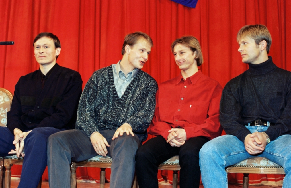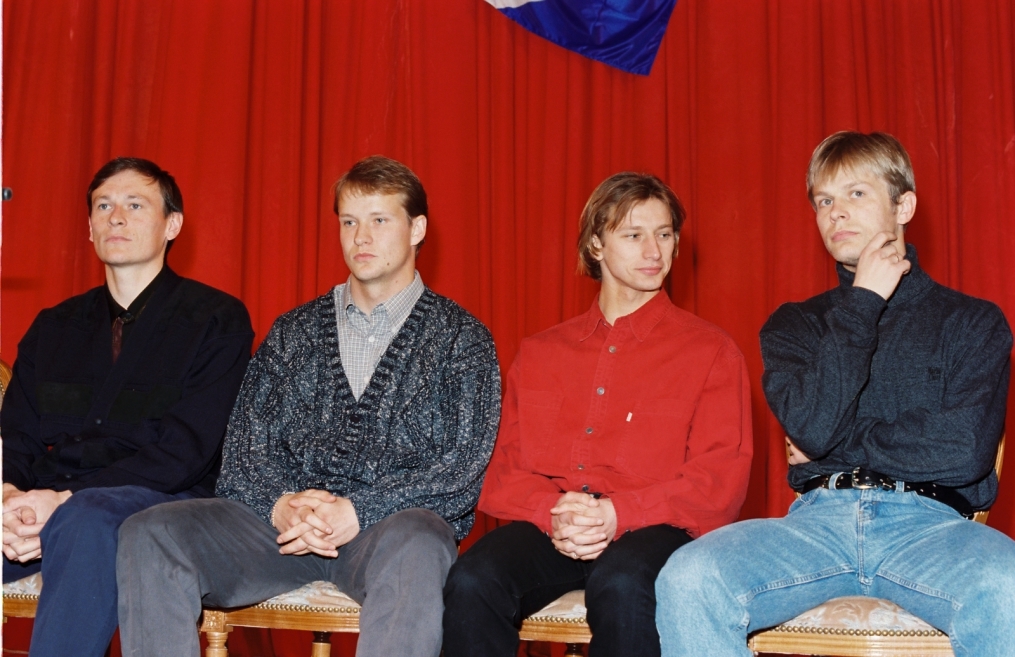 Описание: 1997 год. Россия. Санкт-Петербург. Встреча с болельщиками. На снимке: футболисты ФК «Зенит» Андрей Курдюмов, Олег Дмитриев, Александр Свистунов, Ирмантас Стумбрис.