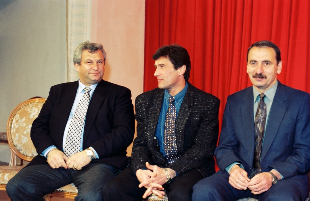 Описание: 1997 год. Россия. Санкт-Петербург. Встреча с болельщиками. На снимке: директор футбольной школы «Зенит» Евгений Шейнин, тренер ФК «Зенит» Анатолий Давыдов, тренер вратарей Леонид Колтун,