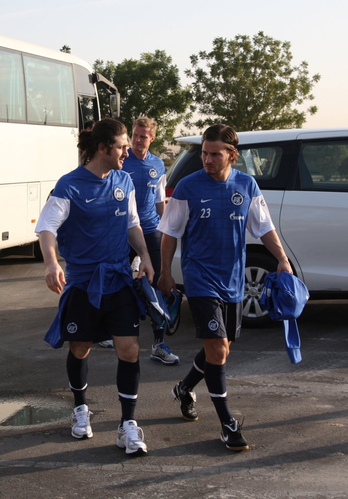 Описание: Тренировка футболистов петербургского «„Зенита“» на первом предсезонном сборе в Объединённые Арабские Эмираты. День первый. На снимке слева направо; футболисты Фатих Текке, Вячеслав Малафеев и Саболч Хусти