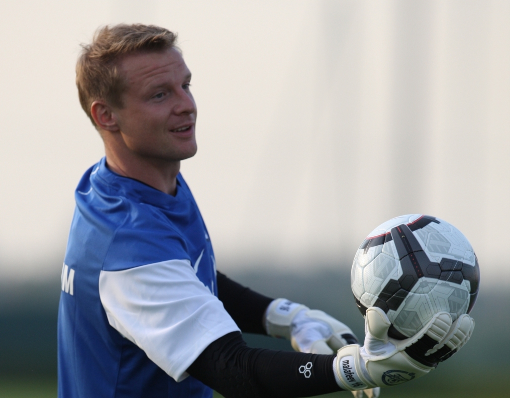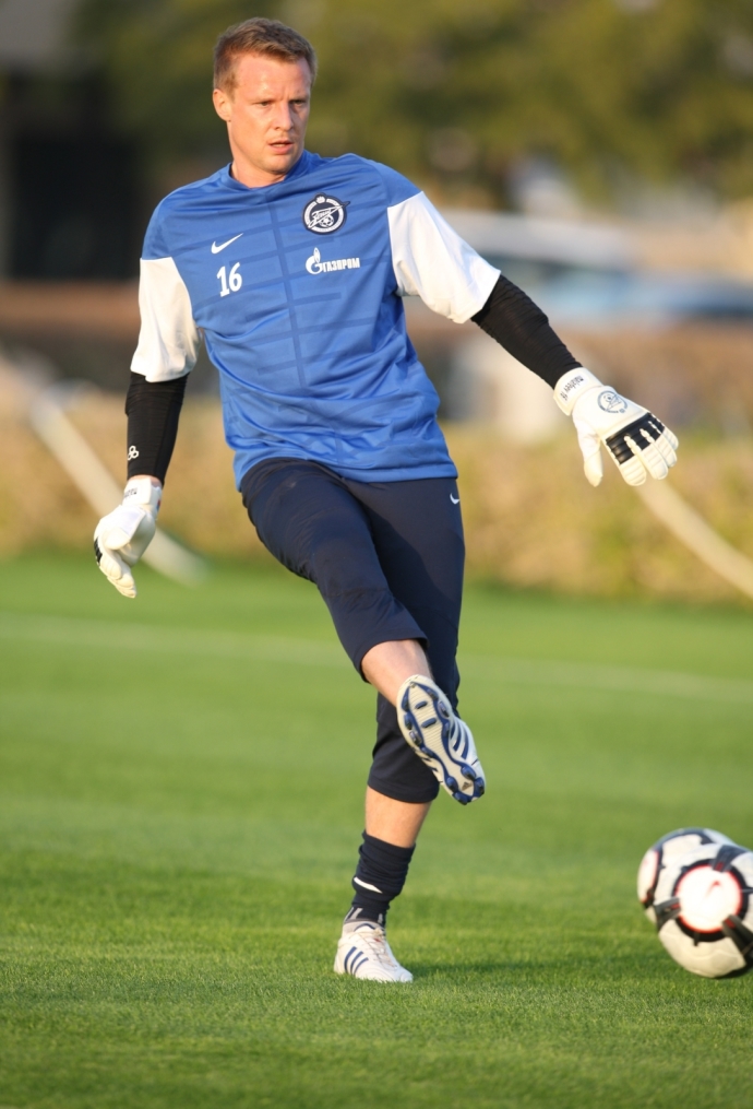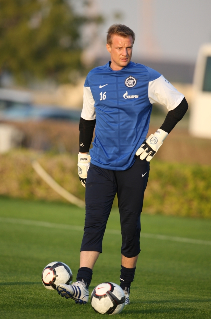 Описание: Тренировка футболистов петербургского «„Зенита“» на первом предсезонном сборе в Объединённые Арабские Эмираты. День первый. На снимке: вратарь Михаил Кержаков