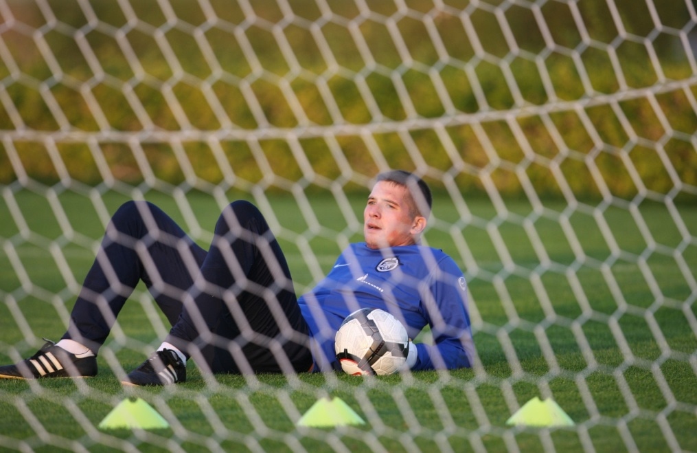 Описание: Тренировка футболистов петербургского «„Зенита“» на первом предсезонном сборе в Объединённые Арабские Эмираты. День первый. На снимке вратарь молодежной команды Андрей Зайцев