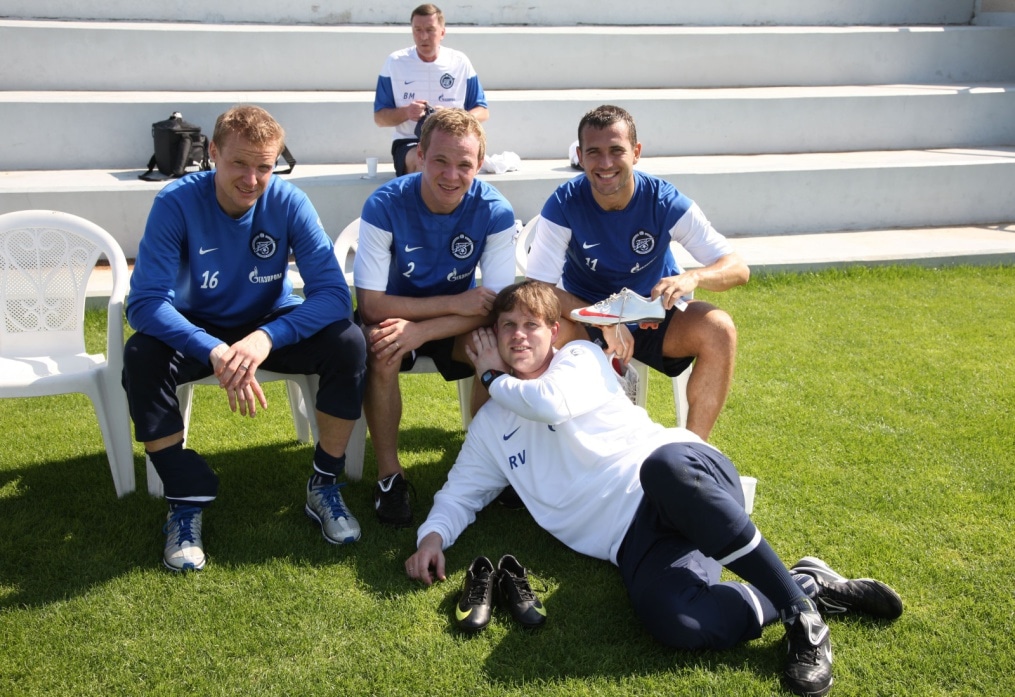 Описание: Тренировка футболистов петербургского «„Зенита“» на первом предсезонном сборе в Объединённые Арабские Эмираты. День второй. На снимке позируют слева направо; вратарь Вячеслав Малафеев, защитник Александр Анюков, нападающий Александр Кержаков и начальник команды Владислав Радимов
