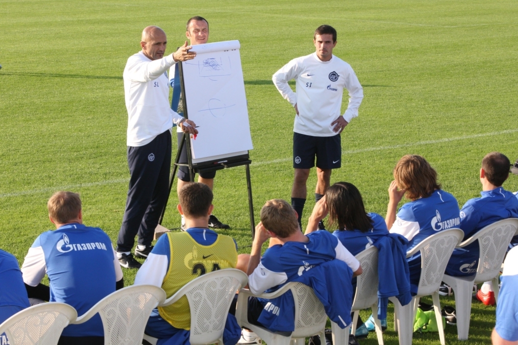 Описание: Тренировка футболистов петербургского «„Зенита“» на первом предсезонном сборе в Объединённые Арабские Эмираты. День второй. На снимке: главный тренер Лучано Спаллетти (слева) и тренер Игорь Симутенков (справа)