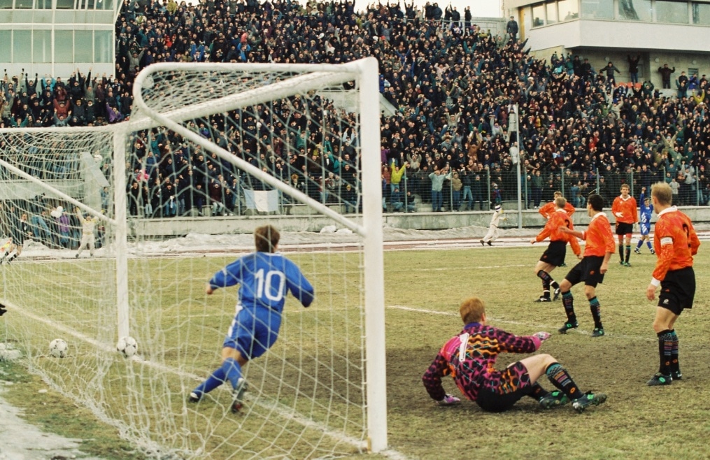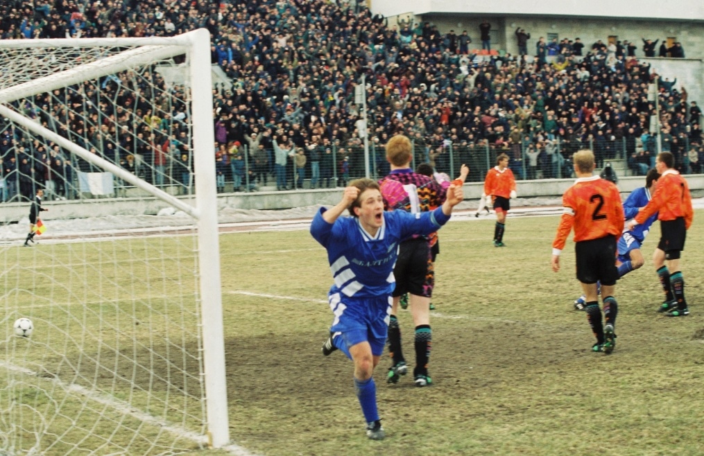 Описание: 16 марта 1996 года. Россия. Санкт-Петербург. Стадион «Петровский». Чемпионат России. «Зенит» — «Уралмаш» Екатеринбург. На снимке: только что зенитовец Владимир Кулик забил победный гол.