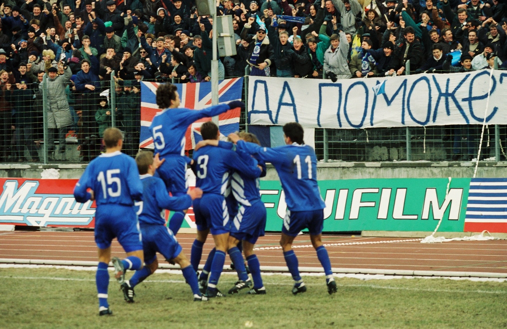 Описание: 16 марта 1996 года. Россия. Санкт-Петербург. Стадион «Петровский». Чемпионат России. «Зенит» — «Уралмаш» Екатеринбург. На снимке: только что зенитовец Владимир Кулик забил победный гол. На заднем плане — Денис Зубко и Олег Еремин.