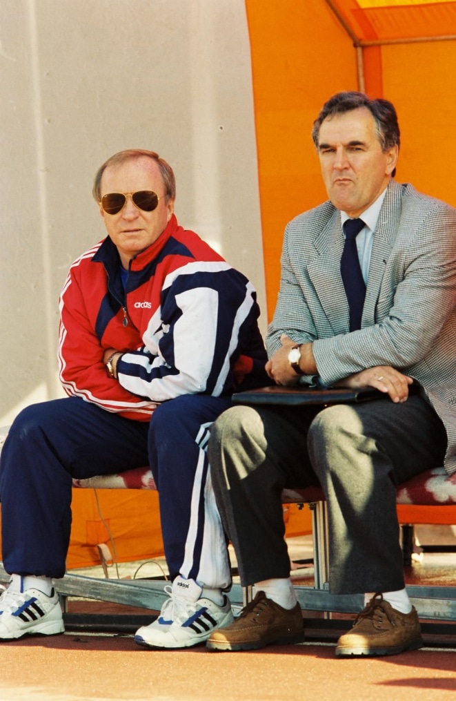 Описание: 1996 год. Россия. Санкт-Петербург. Стадион «Петровский». На снимке: главный тренер ФК «Зенит» Павел Садырин и тренер ФК «Зенит» Георгий Вьюн.