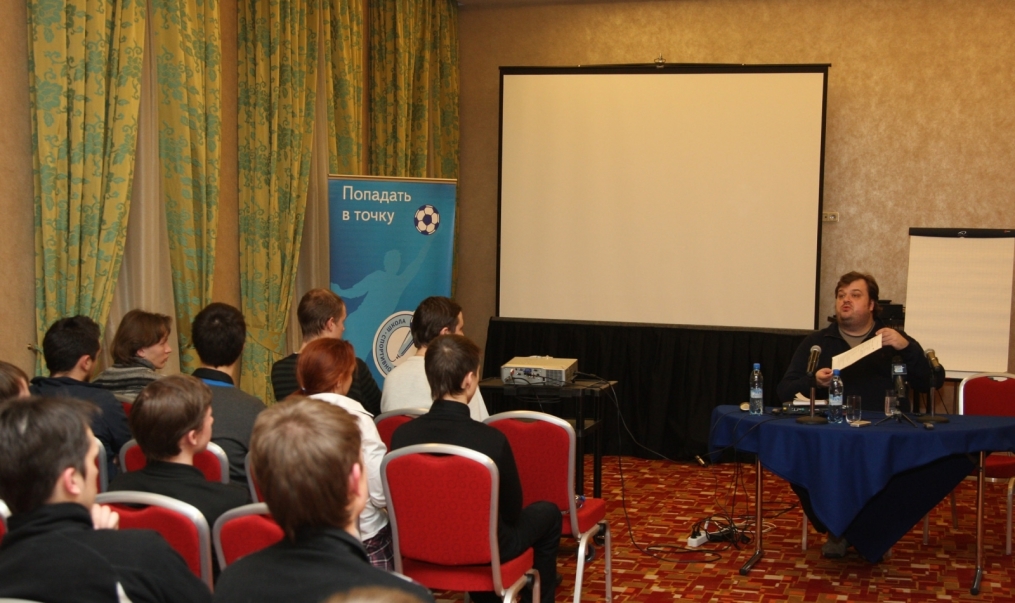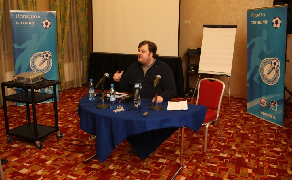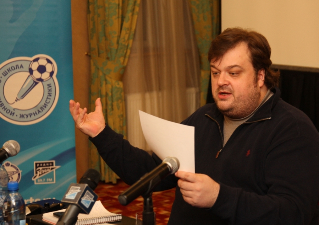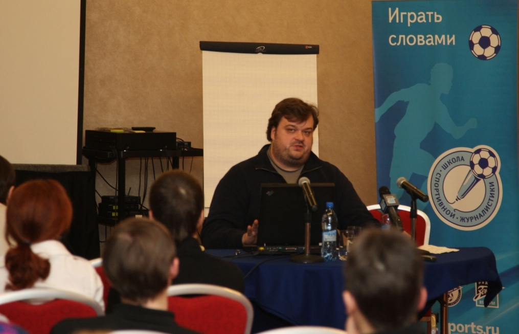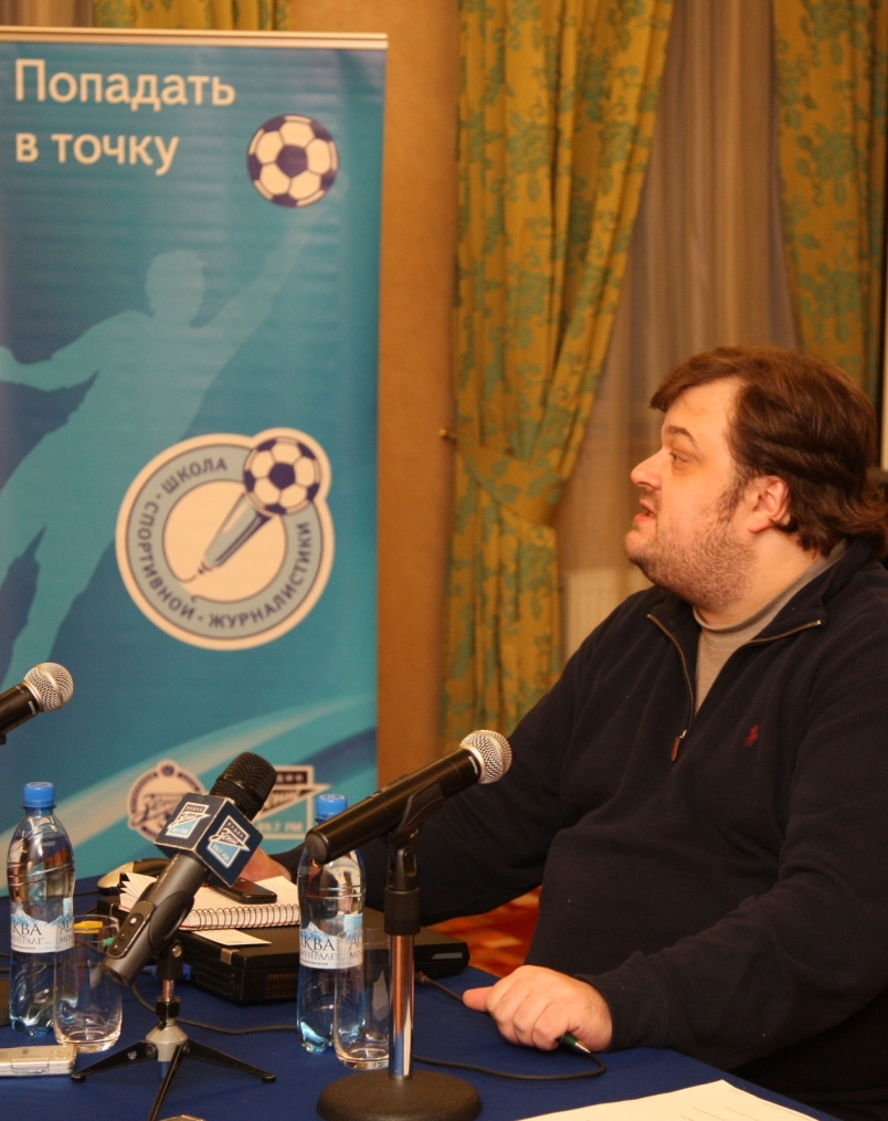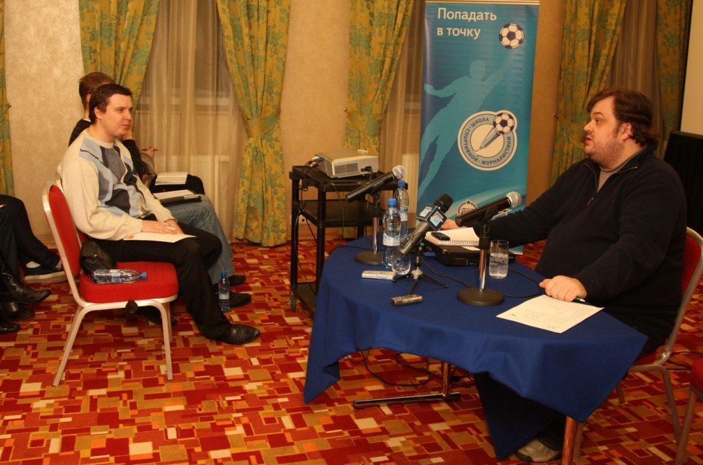 Описание: Футбольный Клуб «Зенит» проводит цикл семинаров для начинающих спортивных журналистов. На снимке: лекция автор программы «Футбольный клуб», комментатора телеканала НТВ+ Василия Уткина