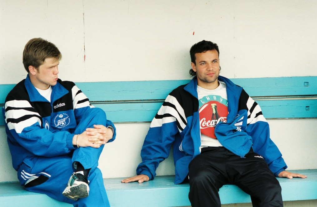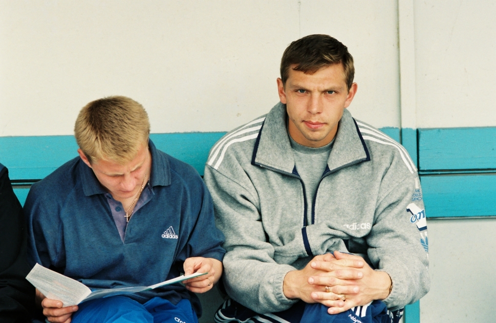 Описание: 1997 год. Россия. Селятино. Стадион «Строитель». На снимке: зенитовцы Александр Панов и Андрей Кондрашов.