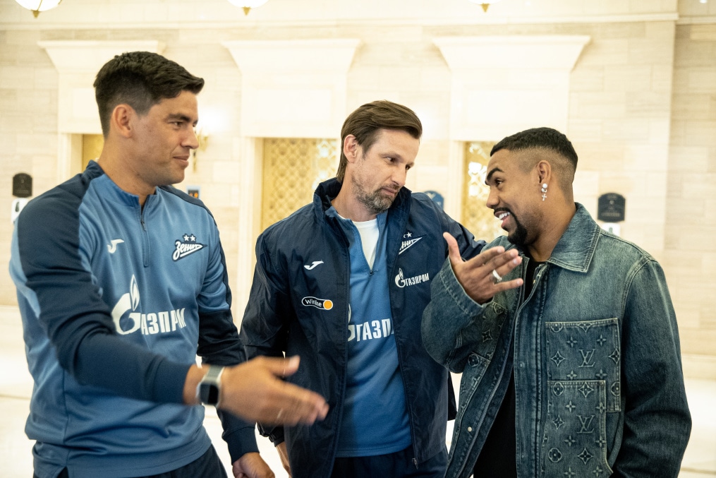 Описание: 04.02.2024. Катар, Доха, «Эспайер». Зимние «Газпром» — тренировочные сборы в Катаре: вечерняя тренировка. На снимке: Вильям де Оливейра, тренер ФК «Зенит», Сергей Семак, главный тренер ФК «Зенит», Малком, нападающий ФК «Аль-Хиляль».